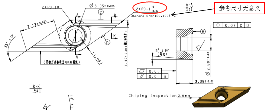 例如 VBET 110301FR-Y,图上标注2×R0.1(0,-0.02),此R角符合圆角特点R≥0.1为锥R规律,同时右下角3D图片核实为锥R,则利用公式,输入图纸要求的圆角r公称值0.1,输入图纸要求的S2值0.2,输入刀片的刀尖后角θ=5°,计算得结果为0.122,即可圆角周边磨加工为R0.122(0,-0.02)。